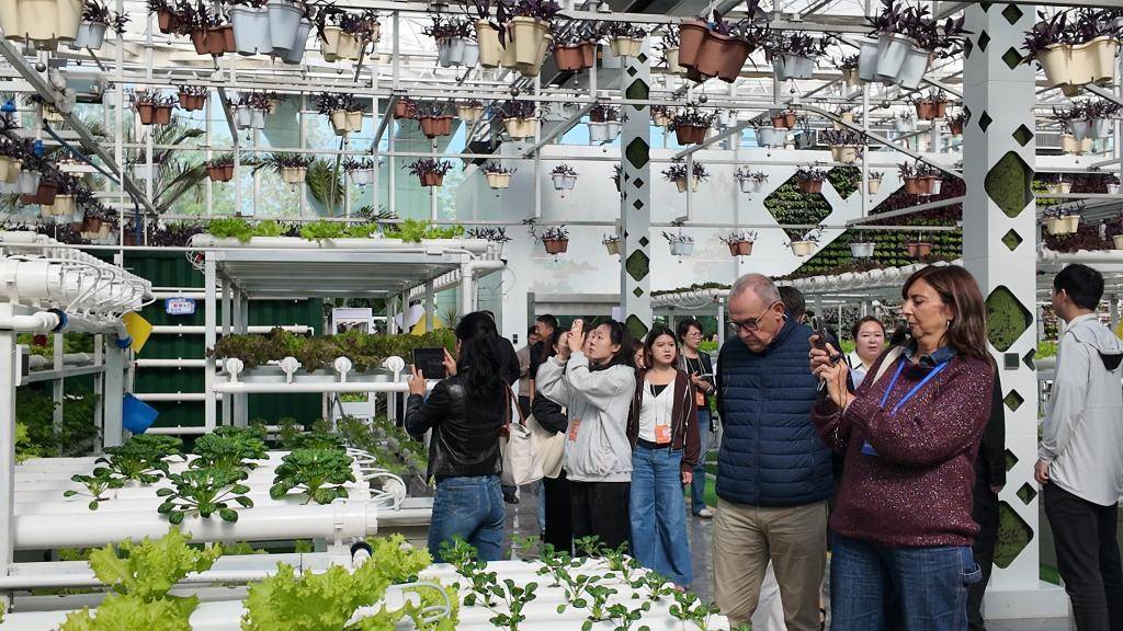 r走进昌吉新疆农业博览园内的垂直农业展示区、叶菜工厂示范区和果菜工厂示范区,目睹无土栽培、无人机灌溉、光合作用智能调控等一系列农业高科技应用为作物“量身定制”生长环境,参访议员们纷纷拍照记录。