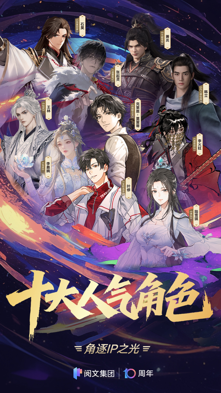10月1日晚间,“阅文十周年·角逐IP之光”正式揭晓总榜。这场为期20天的人气IP角色评选,共吸引3000万人次用户参与。最终,《诡秘之主》克莱恩·莫雷蒂、《仙逆》李慕婉、《全职高手》叶修,摘得前三名。此外,《诛仙》陆雪琪、《盗墓笔记》张起灵、《仙逆》王林、《完美世界》石昊、《凡人修仙传》韩立、《道诡异仙》李火旺、《斗破苍穹》萧炎,同样位列“十大人气角色”榜单。