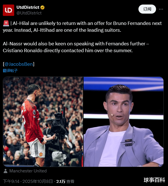 据talkSPORT电台记者Ben Jacobs透露,尽管今年夏天遭到了B费的拒绝,但利雅得胜利一直在关注着B费的动向。甚至C罗已经直接与这位同胞通话,讨论了在利雅得相聚的可能性。过去3个赛季,C罗一直在沙特踢球,他在今年夏天就与B费关于转会事宜有过交流。