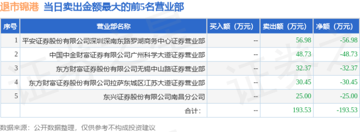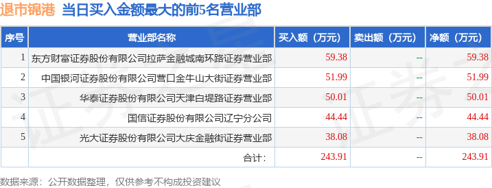 证券之星消息,沪深交易所2025年7月4日公布的交易公开信息显示,退市锦港(600190)因有价格涨跌幅限制的日收盘价格涨幅偏离值达到7%的前五只证券配资广告,退市整理的证券登上龙虎榜。此次是近5个交易日内第5次上榜。